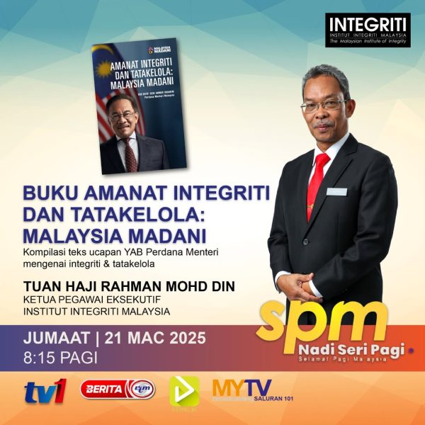 Saksikan temu bual eksklusif bersama Tuan Haji Rahman bin Mohd Din, Ketua Pegawai Eksekutif, Institut Integriti Malaysia dalam program Selamat Pagi Malaysia (SPM) esok.