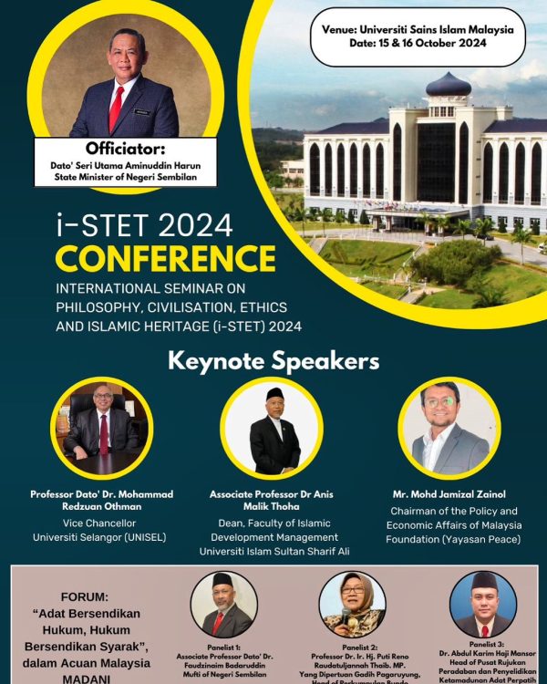 We invite you to the International Seminar on Philosophy, Civilisation, Ethics, and Islamic Heritage (i-STET) 2024, hosted by Universiti Sains Islam Malaysia (USIM) on 15th & 16th October 2024.